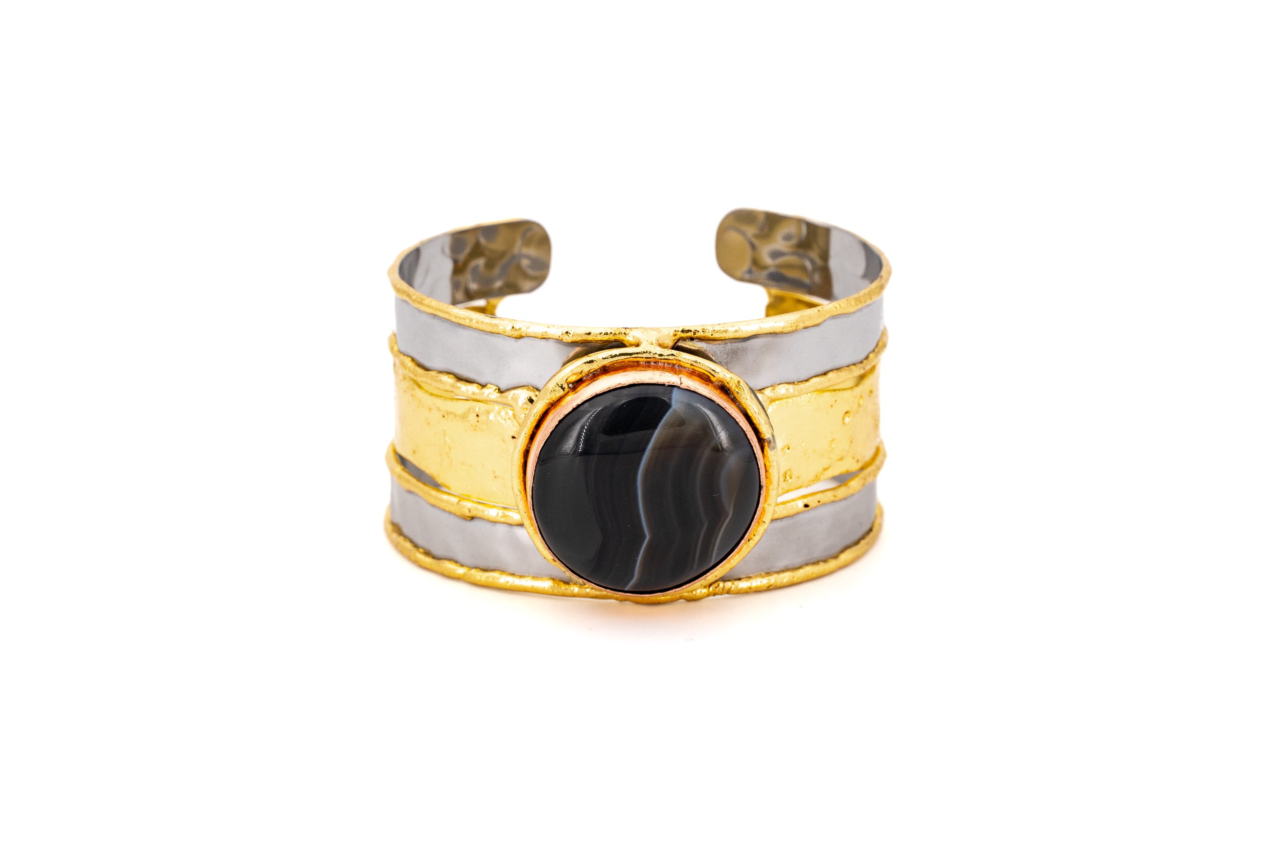 BRACCIALE OTTONE E ACCIAIO FASCIA PIETRA AGATA RIGATA NERA SH381