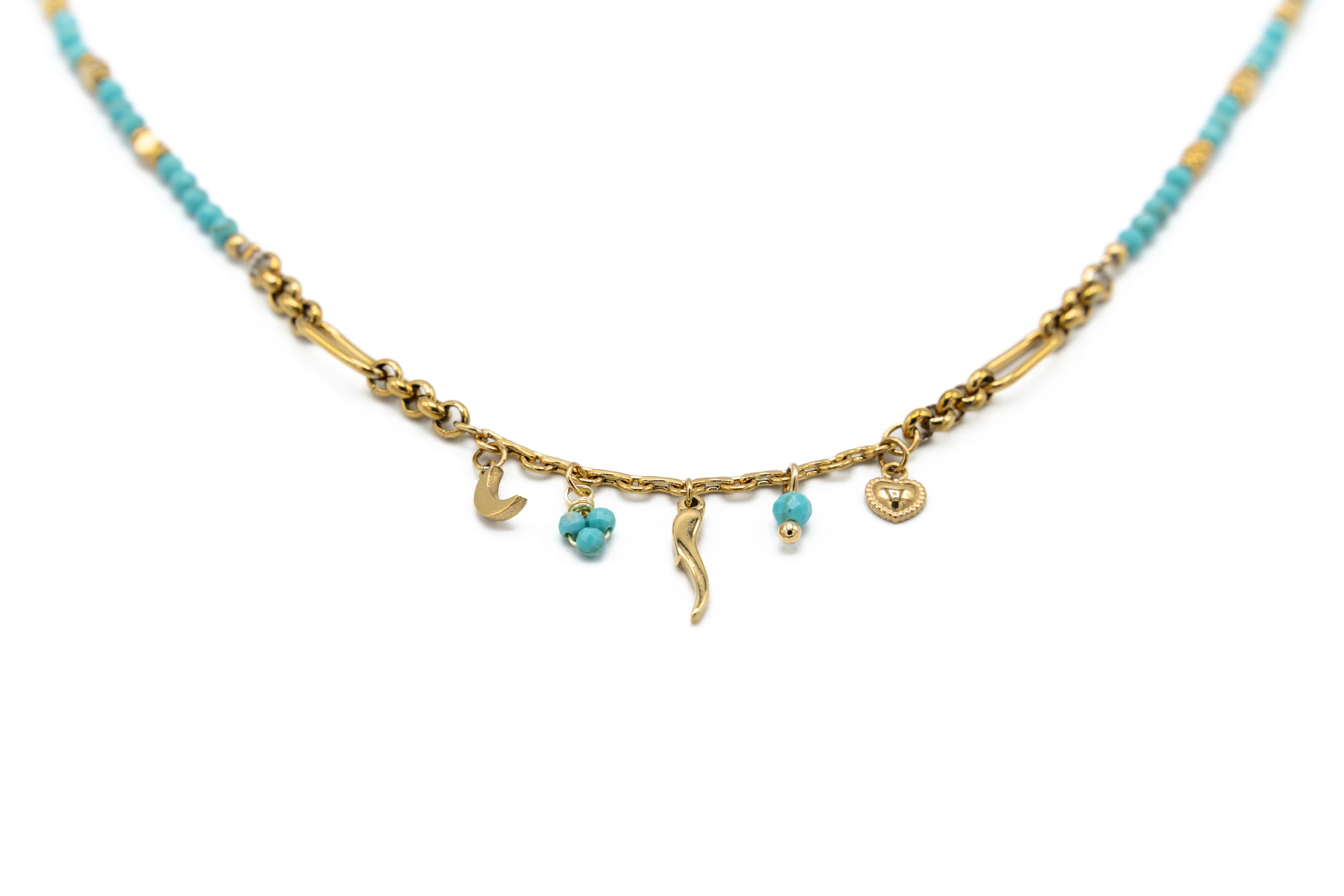 COLLANA CORTA ACCIAIO PIETRE TURCHESI CORNO,CUORE,LUNA PENDENTI LN12